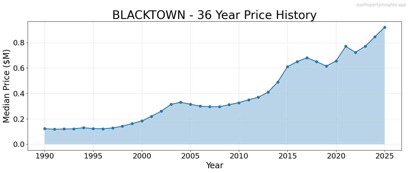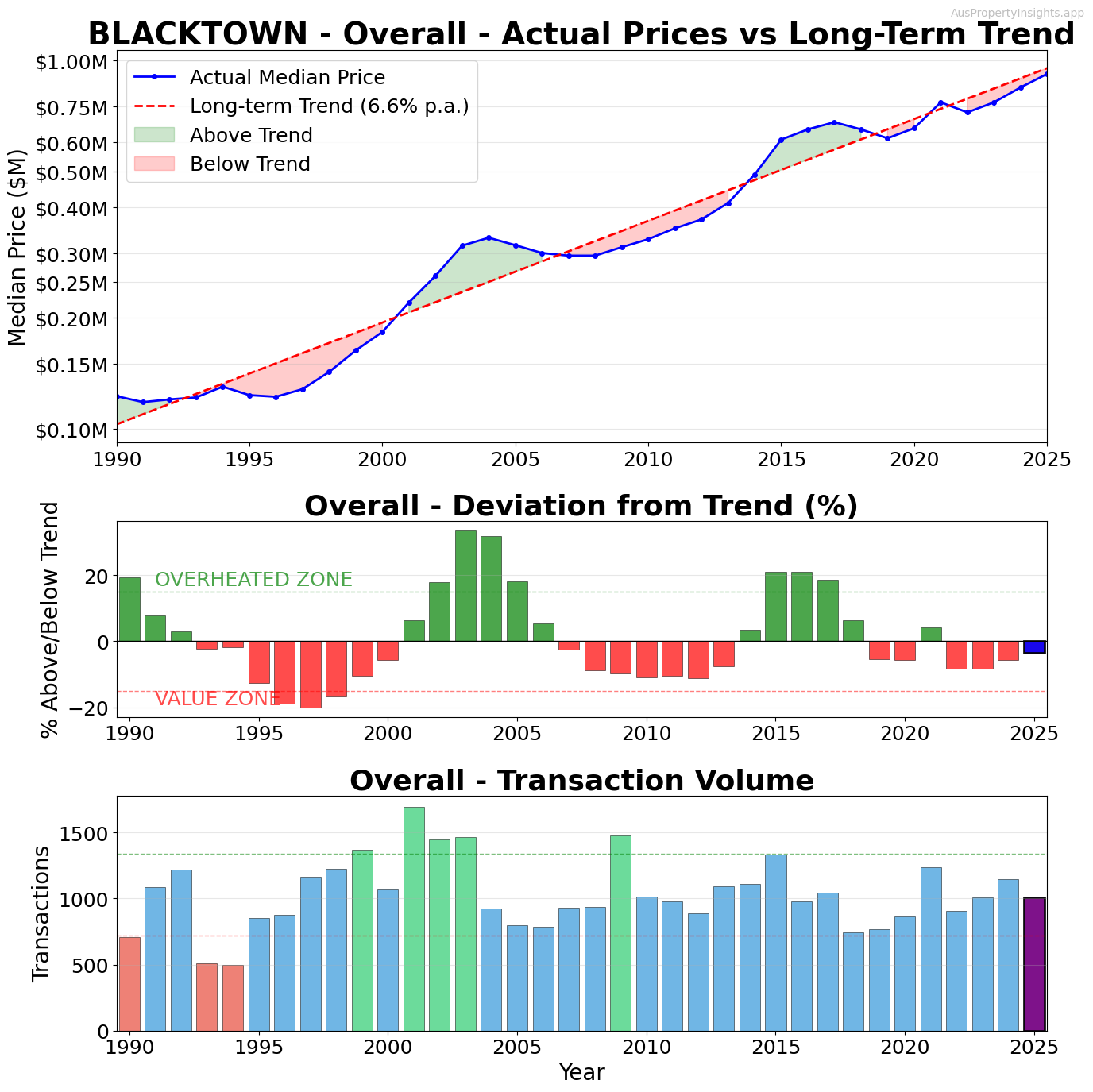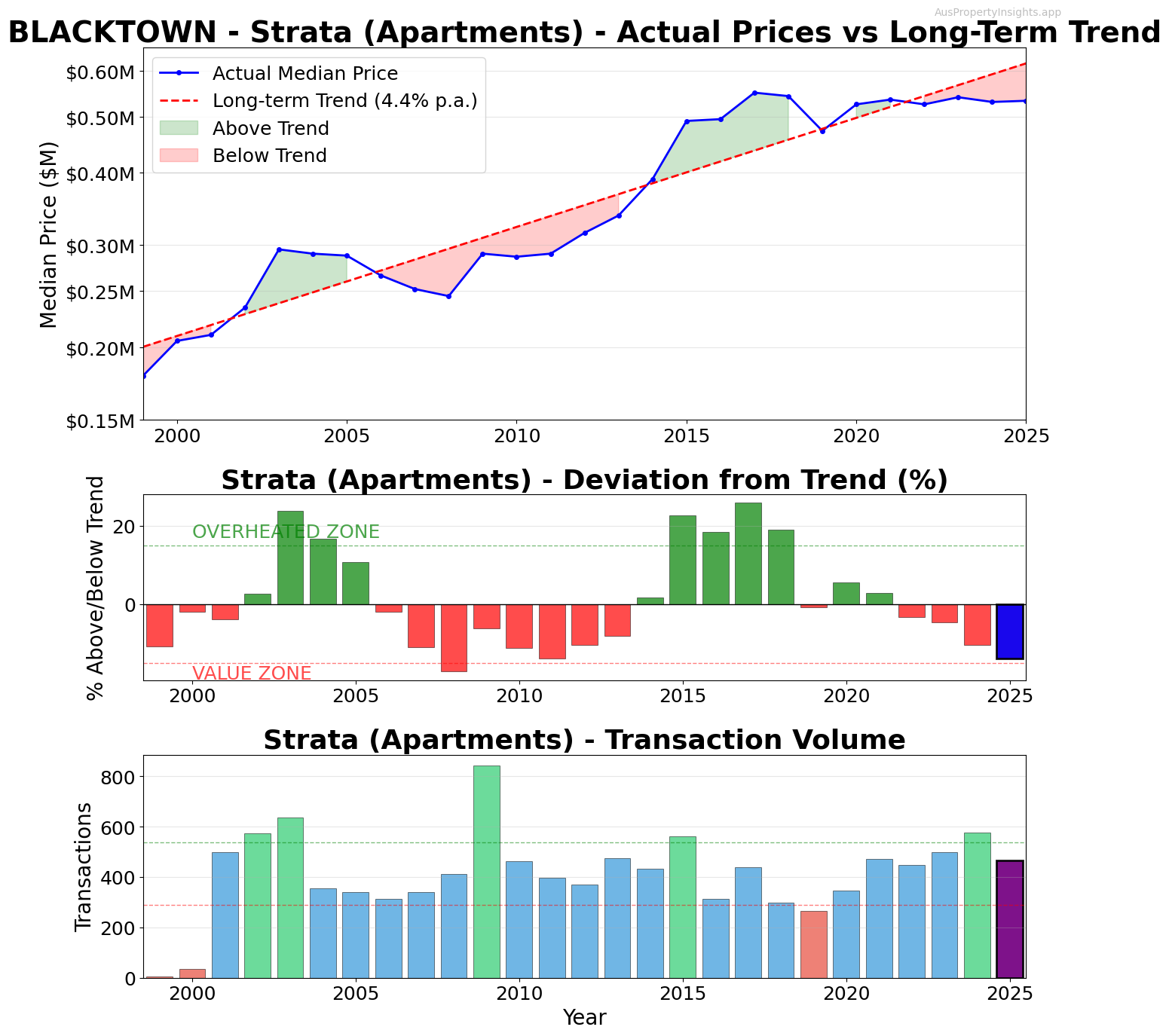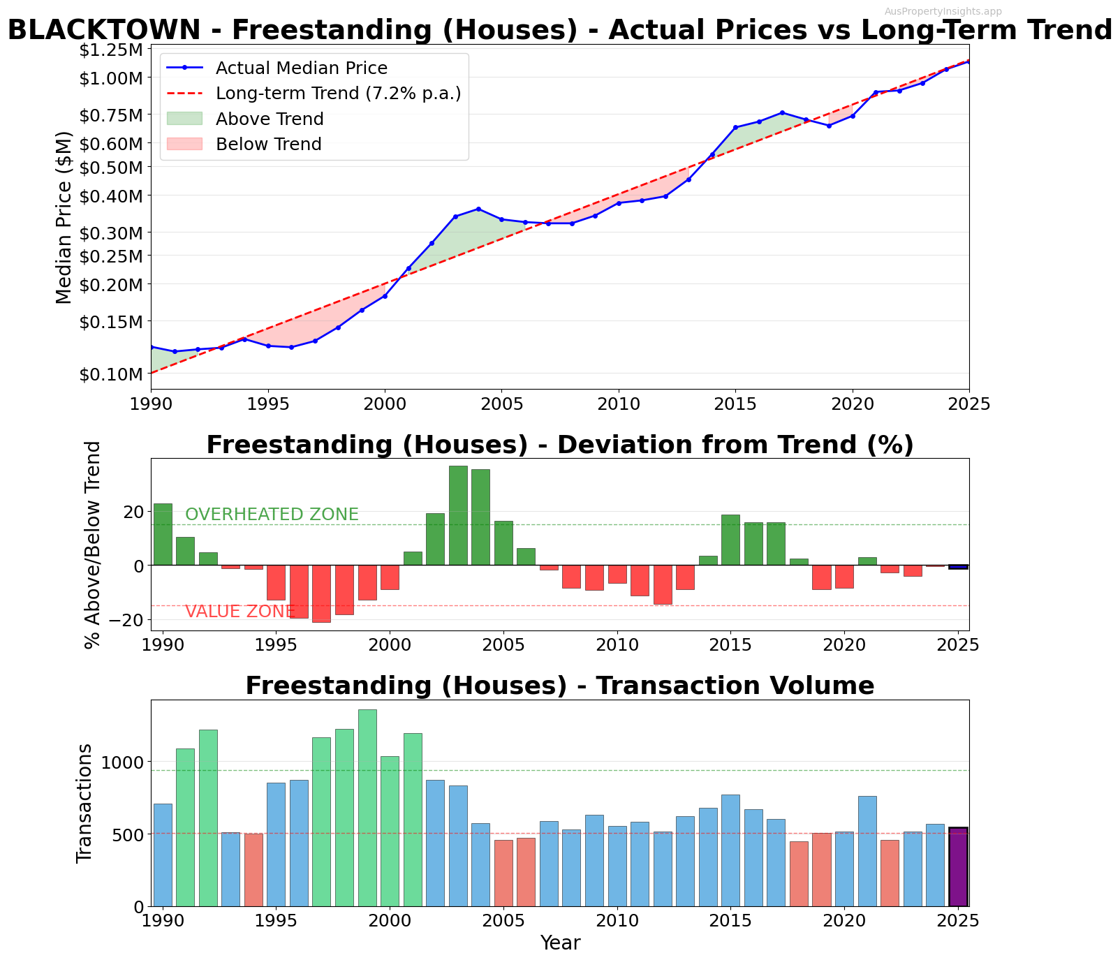 DATA QUALITY DISCLAIMER: Trend analysis uses exponential regression on median prices which may not capture all market dynamics. Deviation from trend is a statistical measure, not a guarantee of future performance. Low transaction volumes in some years can produce unreliable trend estimates. Property cycles vary in length and magnitude, and past patterns may not repeat.